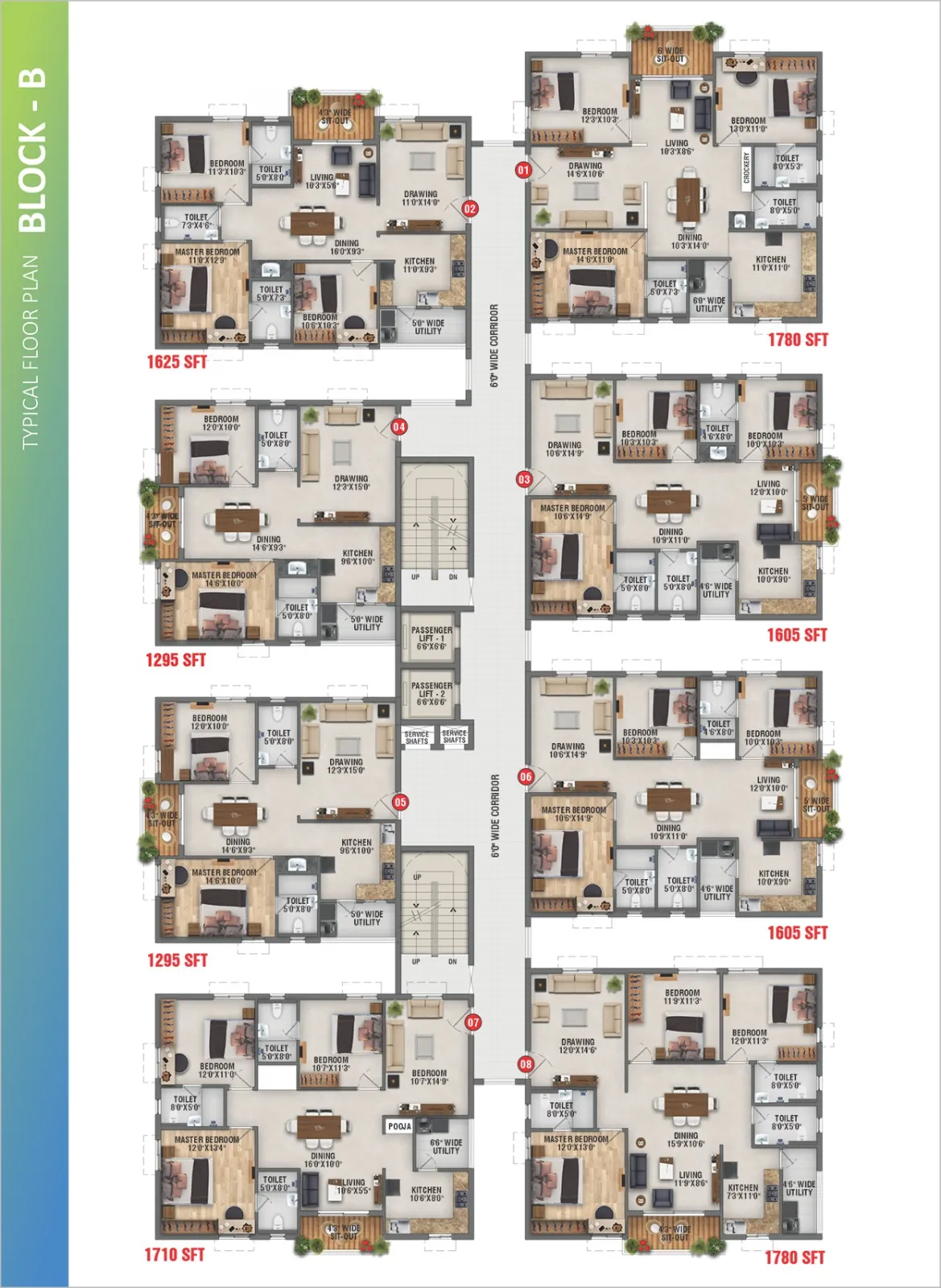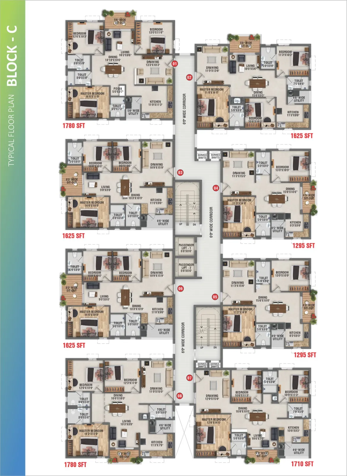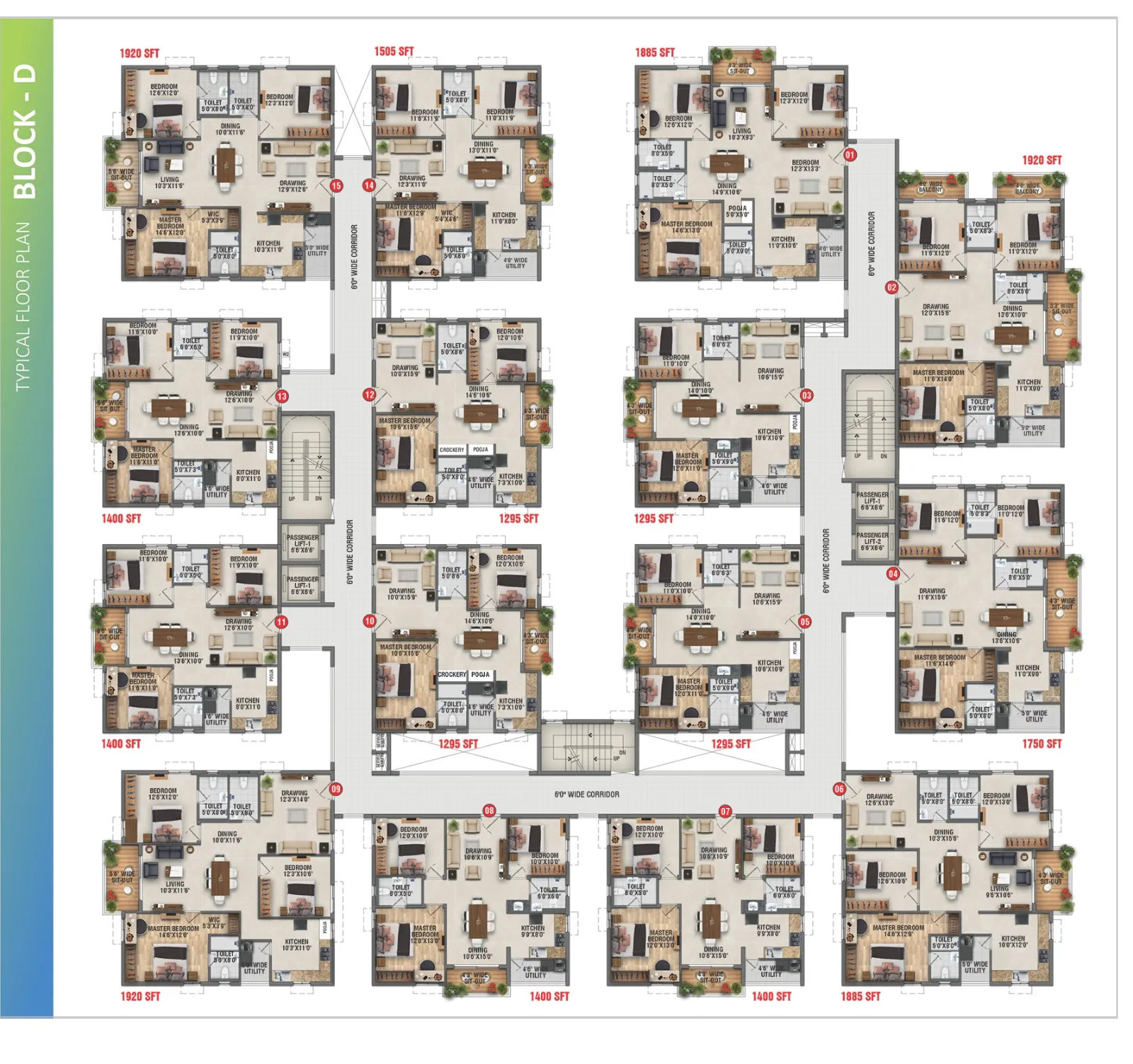 Corridors: Combination of granite/ vitrified tiles as per design by architect.